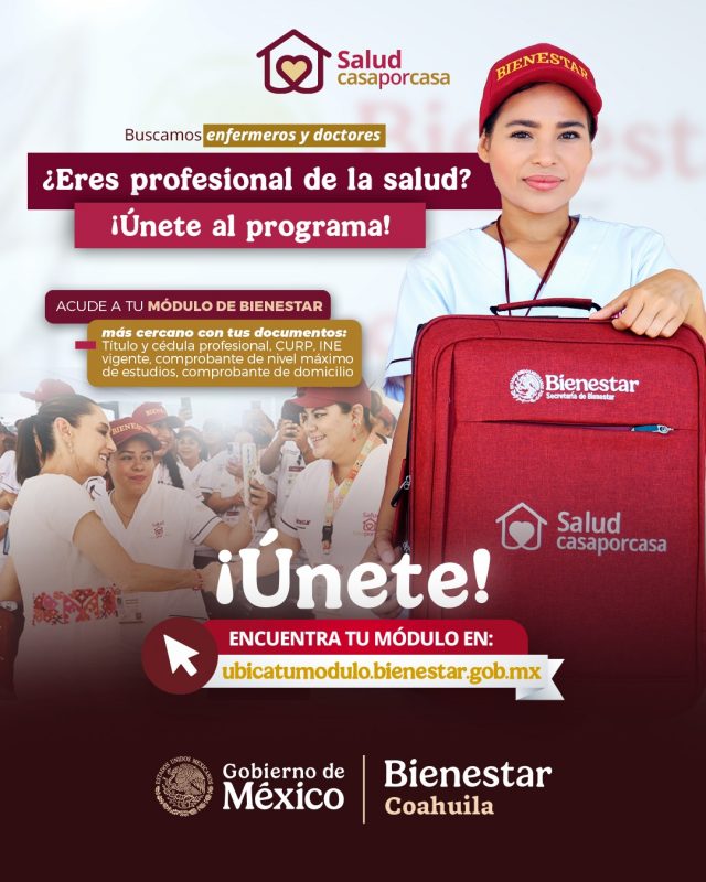 En Coahuila, la Delegación de Bienestar mantiene abierta la convocatoria para integrarse al programa Salud Casa por Casa, dirigida a enfermeros y médicos, con el objetivo de fortalecer la atención en territorio.