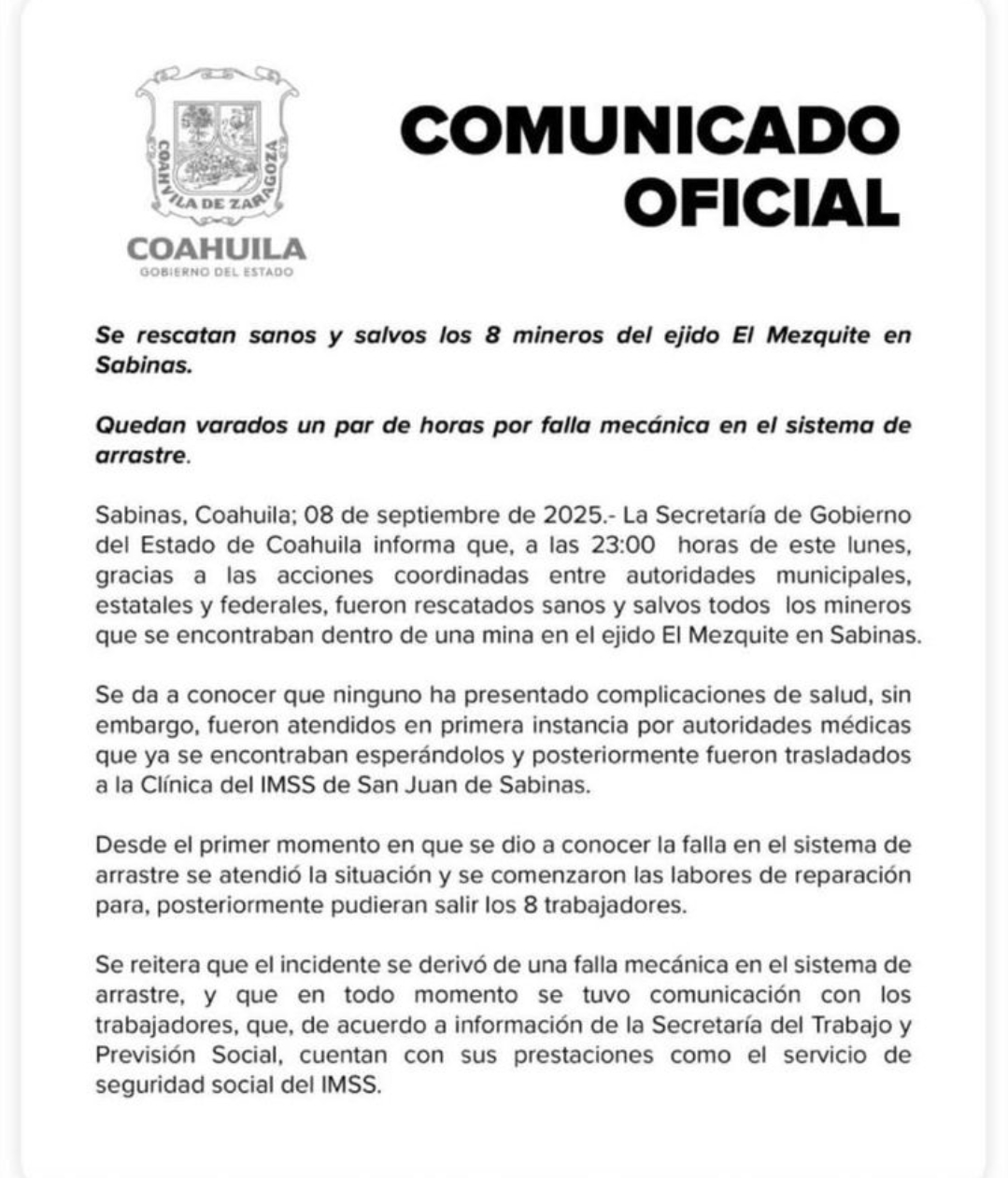 Quedaron varados dos horas por falla mecánica en el sistema de arrastre.A las 23:00 horas de este lunes 8 de septiembre, gracias a las acciones coordinadas entre autoridades municipales, estatales y federales, fueron rescatados sanos y salvos todos los mineros...