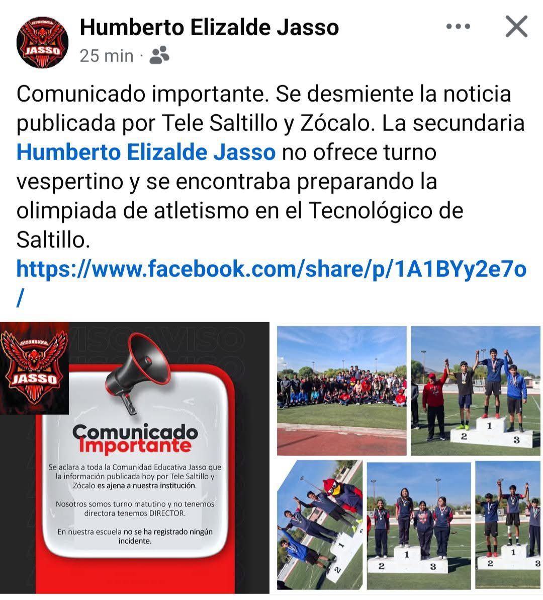 Saltillo, Coah. — En redes sociales comenzó a circular la versión de que un alumno de la Secundaria Humberto Elizalde Jasso había sido detenido por posesión de droga durante un operativo de revisión. Ante la información difundida, la institución emitió...