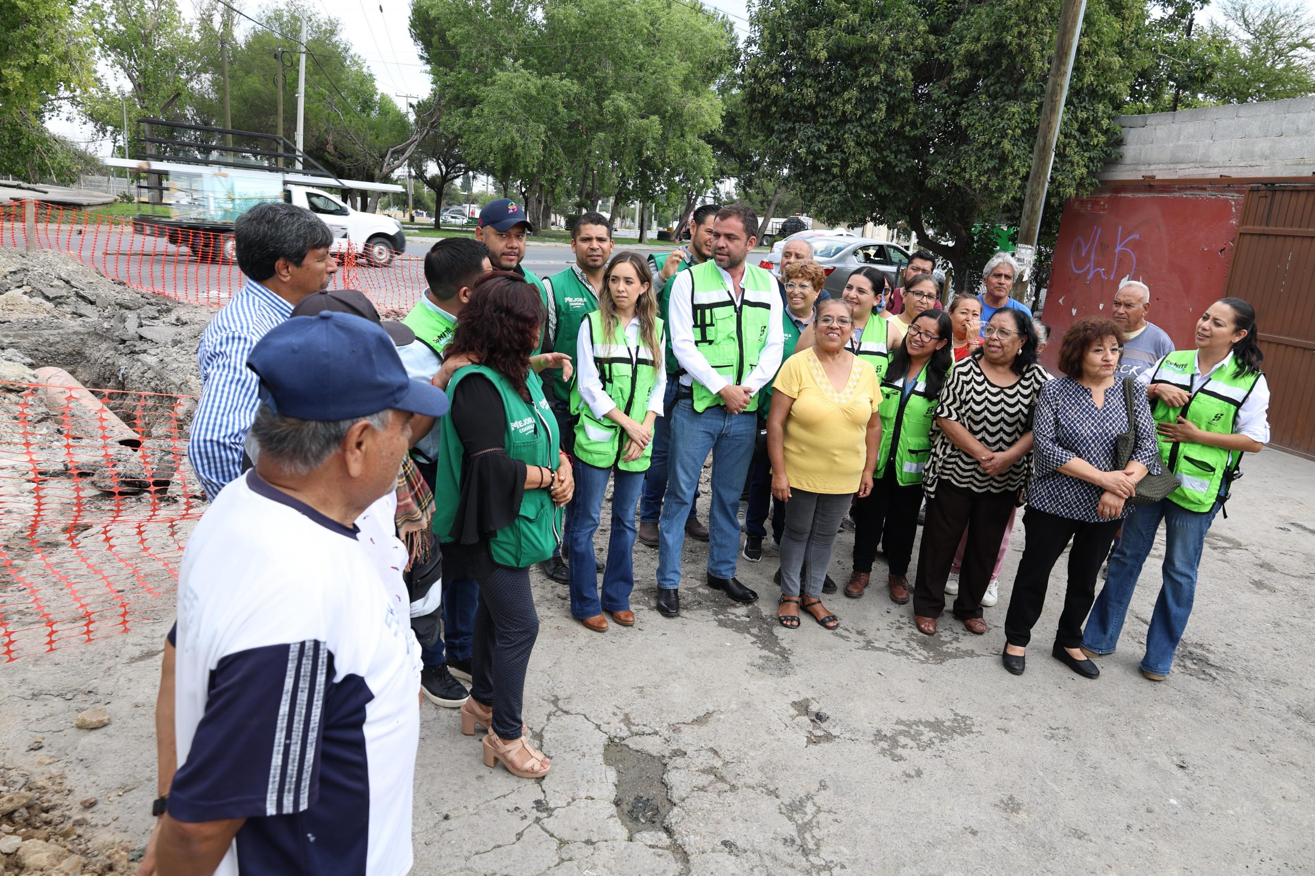 Ernesto Siller Torres, director de Desarrollo Social y Roberto Rojas Oyervides, director de Distrito Centro, acudieron al punto donde se desarrolla la obra para constatar el avance que lleva junto con vecinas y vecinos del sector.