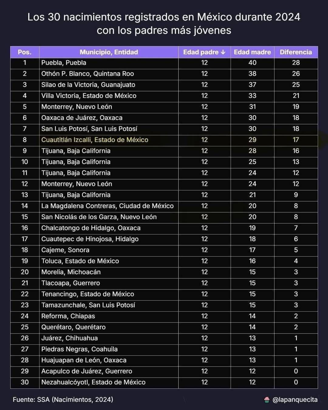 Durante 2024, México registró al menos 30 nacimientos en los que los padres tenían apenas 12 años de edad, según datos de la Secretaría de Salud (SSA).El caso más llamativo ocurrió en Puebla, Puebla, donde el padre tenía 12 años...