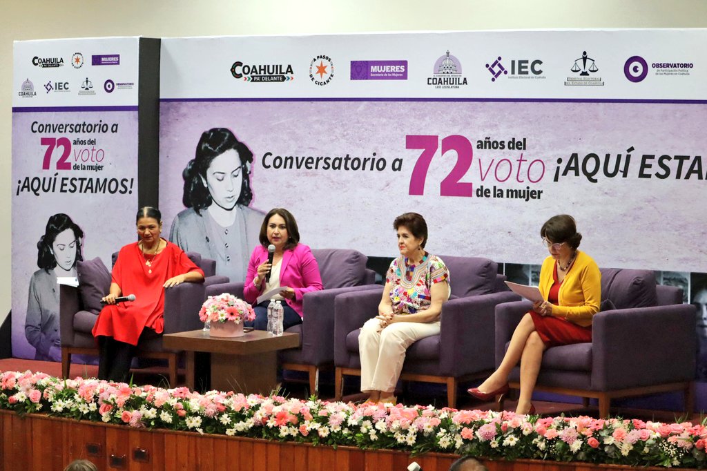 En el marco de la conmemoración del aniversario del voto de las mujeres en México, este 23 de octubre se llevó a cabo el Conversatorio “A 72 años del voto de la mujer, ¡aquí estamos!”, evento organizado por el Instituto Electoral de Coahuila, el Congreso del Estado de Coahuila, el Tribunal Electoral del Estado de Coahuila, la Secretaría de las Mujeres en la entidad, y el Observatorio de Participación Política de las Mujeres en Coahuila.