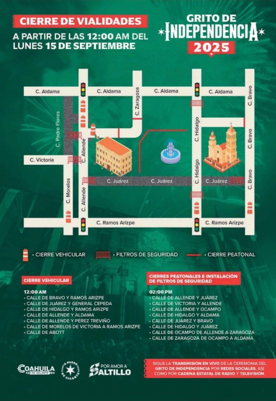 Saltillo, Coahuila de Zaragoza; 14 de septiembre de 2025.- La Comisaría de Seguridad y Protección Ciudadana recordó a la ciudadanía sobre el cierre de vialidades con motivo de las celebraciones de la Independencia de México.