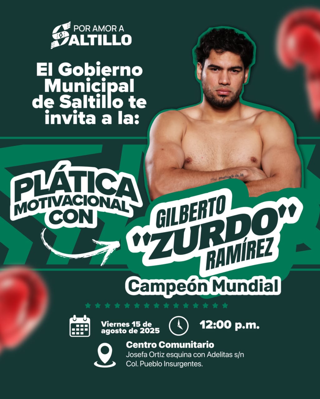 Saltillo, Coahuila de Zaragoza; 14 de agosto de 2025.- El Gobierno Municipal de Saltillo, que encabeza el alcalde Javier Díaz González, invitó a la población en general a la plática motivacional que dará el boxeador y campeón mundial Gilberto “Zurdo” Ramírez en el centro comunitario de la colonia Pueblo Insurgentes.