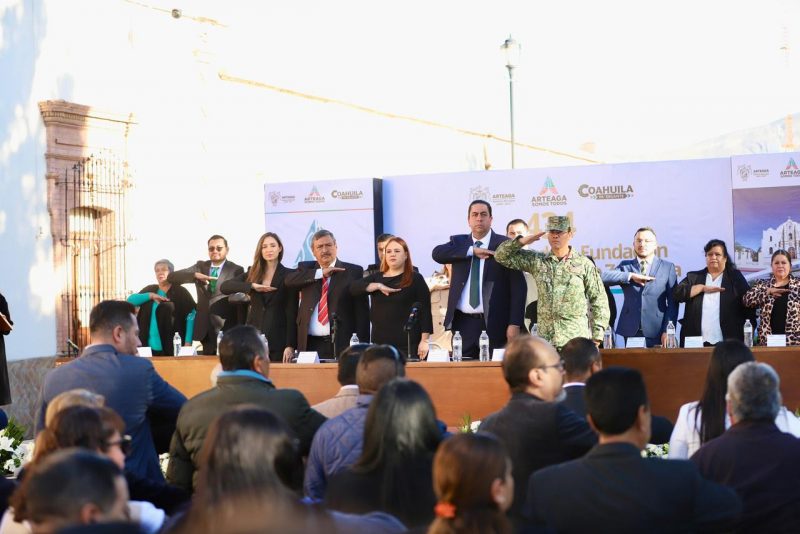 En la explanada de la Presidencia Municipal se rindieron honores a la Bandera a cargo del 69 Batallón de Infantería, y se recordó el legado de las familias tlaxcaltecas y españolas que, en 1591, bajo la guía del Virrey Luis de Velasco, Miguel Caldera y el capitán Francisco de Urdiñola, fundaron la entonces comunidad de San Isidro de las Palomas, hoy Arteaga.