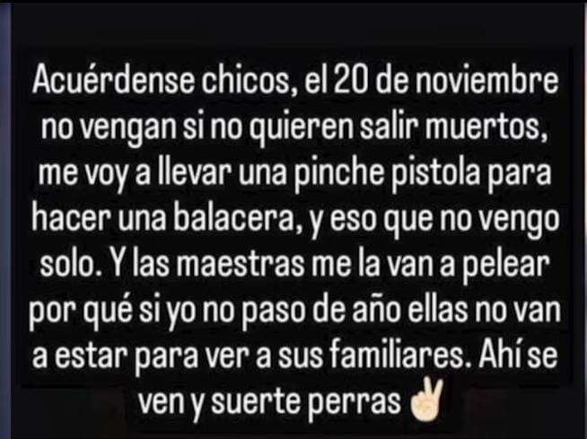 Loera añadió que ninguna advertencia de este tipo puede tomarse a la ligera, por lo que se implementarán acciones para garantizar la seguridad de alumnos, docentes y familias. Además, la dependencia reiteró su disposición para trabajar con los centros educativos en el fortalecimiento de sus mecanismos de prevención y respuesta ante posibles incidentes.