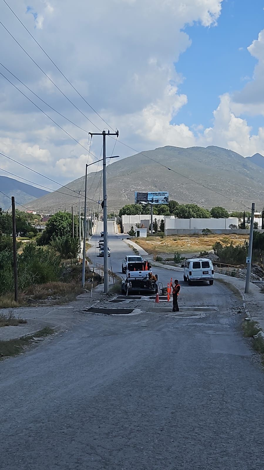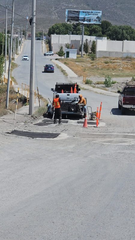 Cuadrillas municipales de bacheo trabajaron en la colonia Autopista como parte del plan de reforzamiento de vialidades que impulsa la administración municipal en Arteaga, Coahuila.