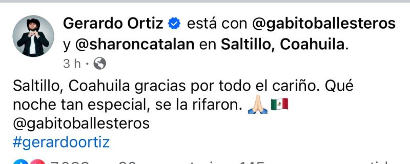 A través de sus redes sociales, Gerardo Ortiz agradeció el cariño de Saltillo, destacando que fue una noche muy especial: