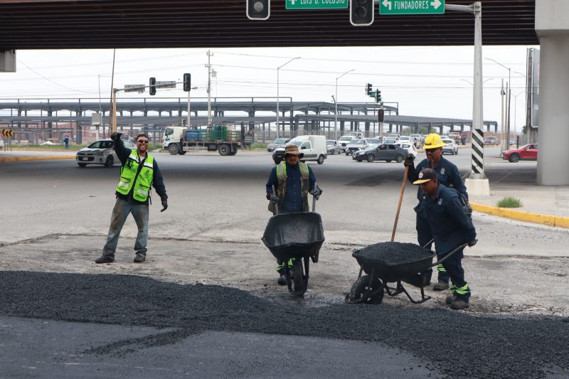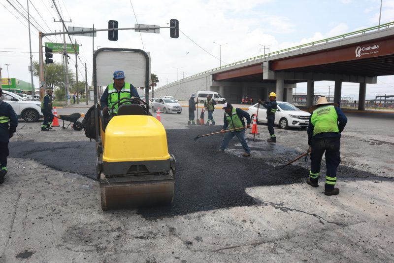 En otros frentes, personal que conforma el programa “Aquí Andamos”, trabaja de manera intensa en la rehabilitación de la carpeta asfáltica de la vialidad lateral del bulevar Fundadores, en su cruce con el bulevar Mirasierra, esto al oriente de Saltillo.