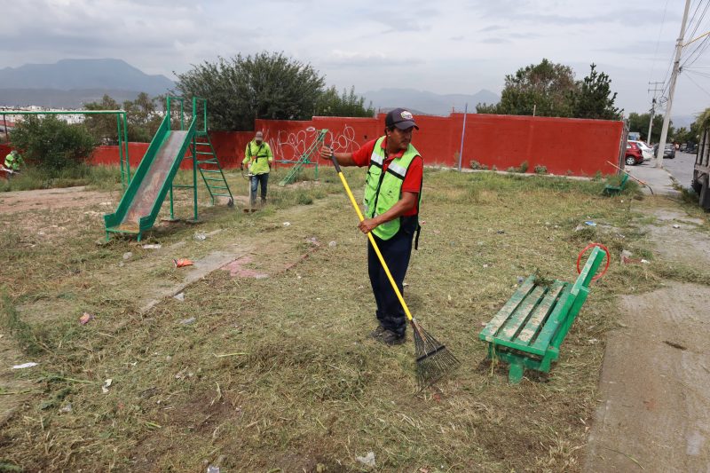 Como ejemplo, este jueves, cuadrillas de la Dirección de Medio Ambiente y Desarrollo Sustentable realizaron acciones de deshierbe y retiro de basura acumulada en las distintas áreas de la plaza pública del fraccionamiento Colinas de San Lorenzo.