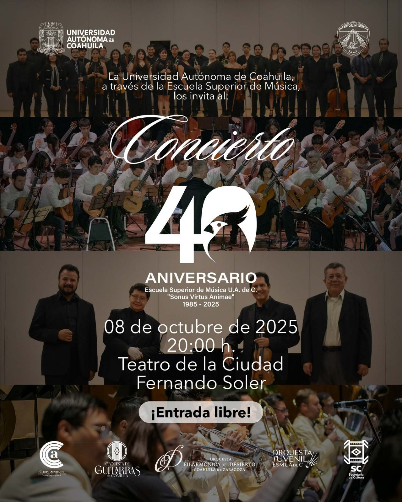 La Escuela Superior de Música de la Universidad Autónoma de Coahuila invita a asistir a su Concierto de 40 Aniversario, que se llevará a cabo el 8 de octubre de 2025 a las 20:00 horas en el Teatro de la Ciudad “Fernando Soler”.