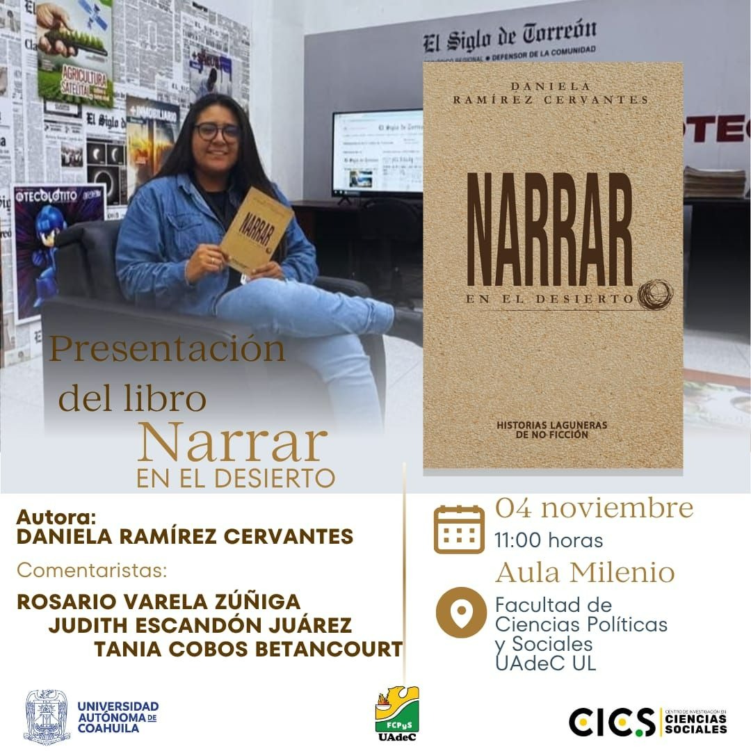 La Universidad Autónoma de Coahuila, a través del Centro de Investigación en Ciencias Sociales y la Facultad de Ciencias Políticas y Sociales, invita a la presentación del libro “Narrar en el desierto. Historias Laguneras de no ficción”, el 4 de noviembre a las 11:00 horas en el Aula Milenio de la FCPyS Unidad Laguna.