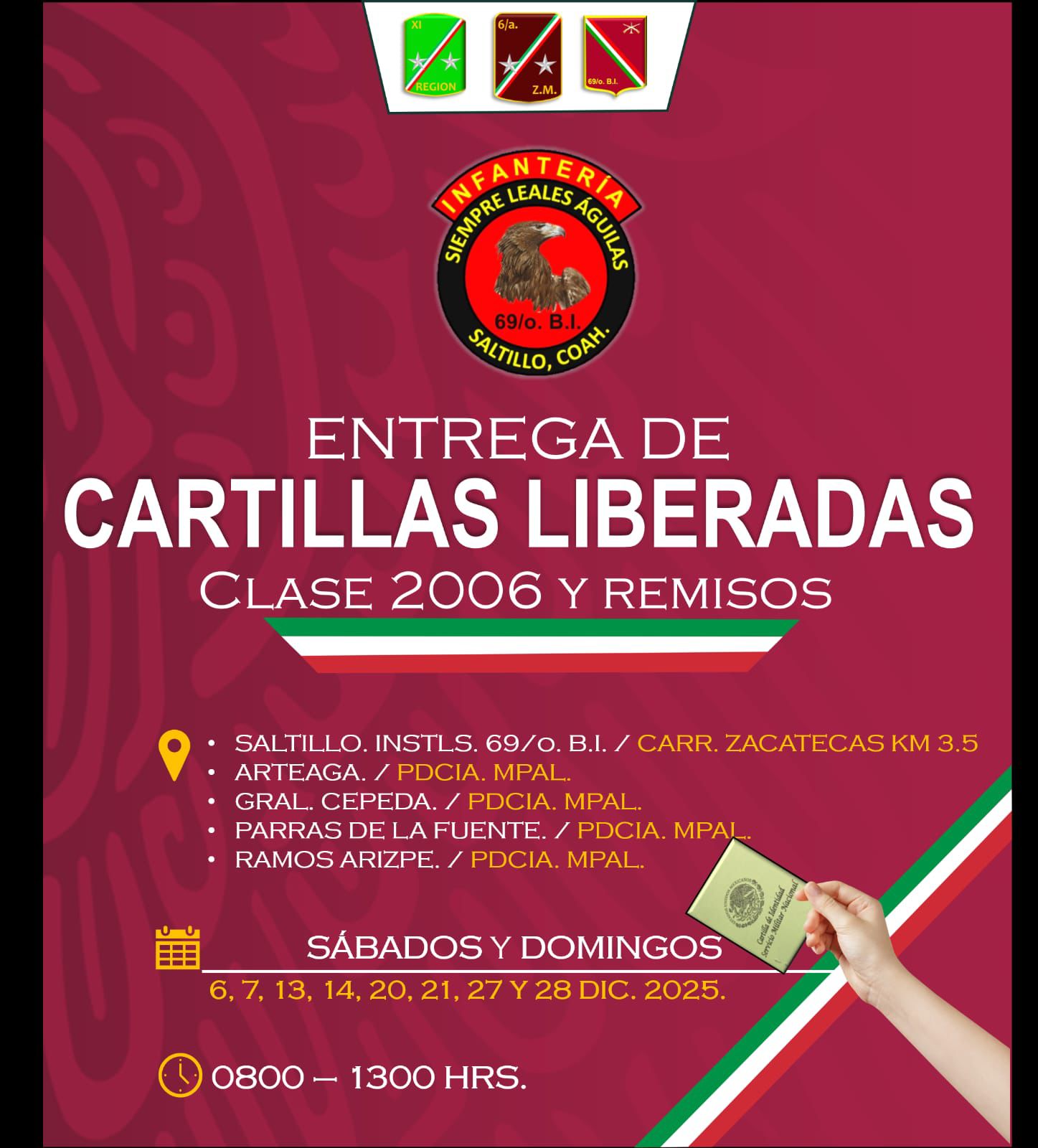 Asimismo, se informó que quienes tengan domicilio en Arteaga, General Cepeda, Parras de la Fuente y Ramos Arizpe deberán acudir a las respectivas presidencias municipales para recibir su cartilla liberada, en las mismas fechas y horarios ya establecidos.