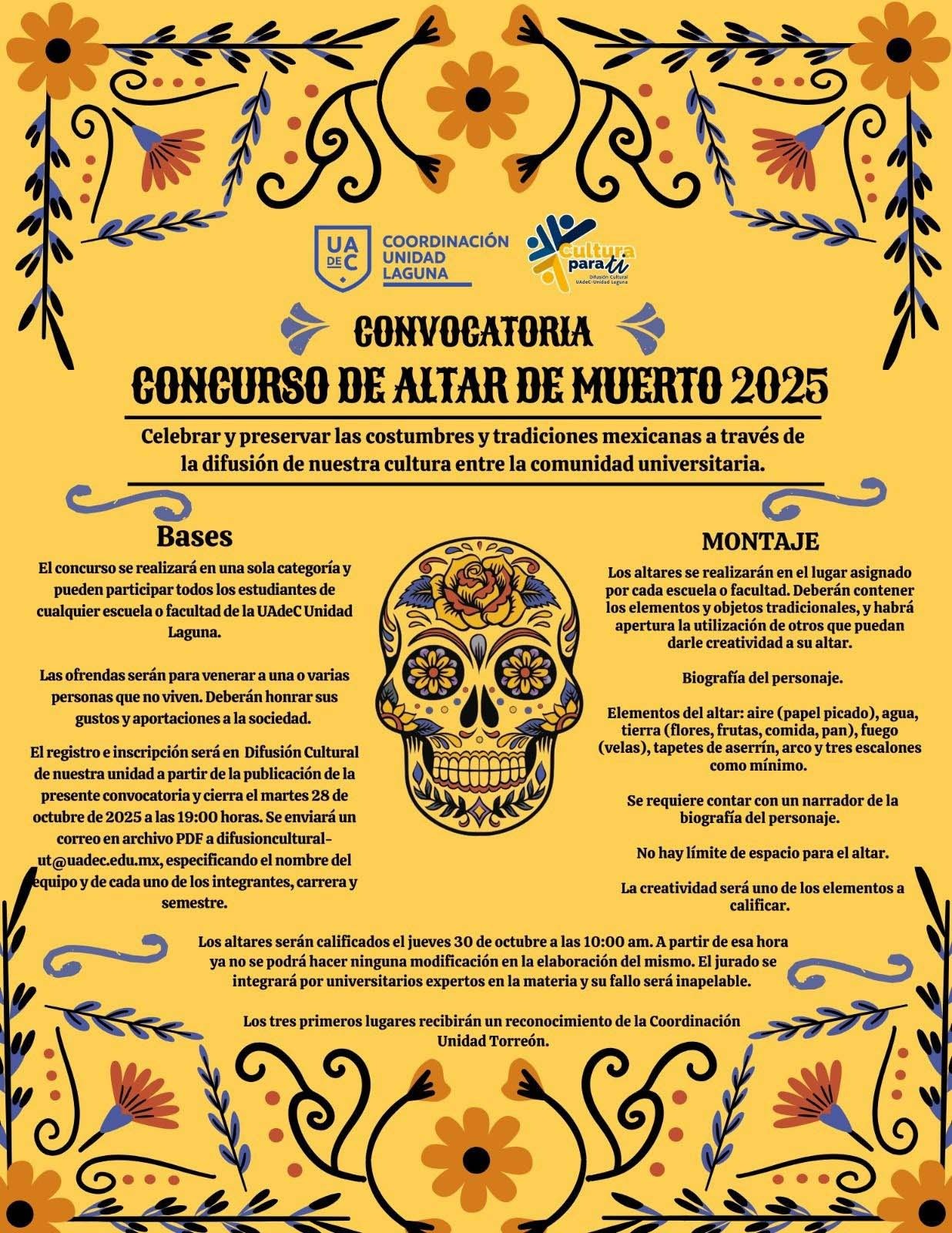 La Universidad Autónoma de Coahuila se prepara para conmemorar el Día de Muertos con actividades artísticas, culturales y académicas en sus tres unidades: Sureste, Laguna y Norte, con el propósito de preservar las tradiciones mexicanas y fomentar la identidad cultural entre la comunidad.