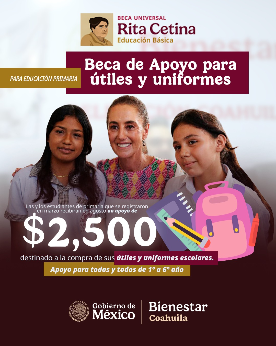En 2026 llega a Coahuila la Beca Universal Rita Cetina para Educación Básica, apoyo destinado a fortalecer la economía de las familias y garantizar mejores condiciones para la educación de los niños.