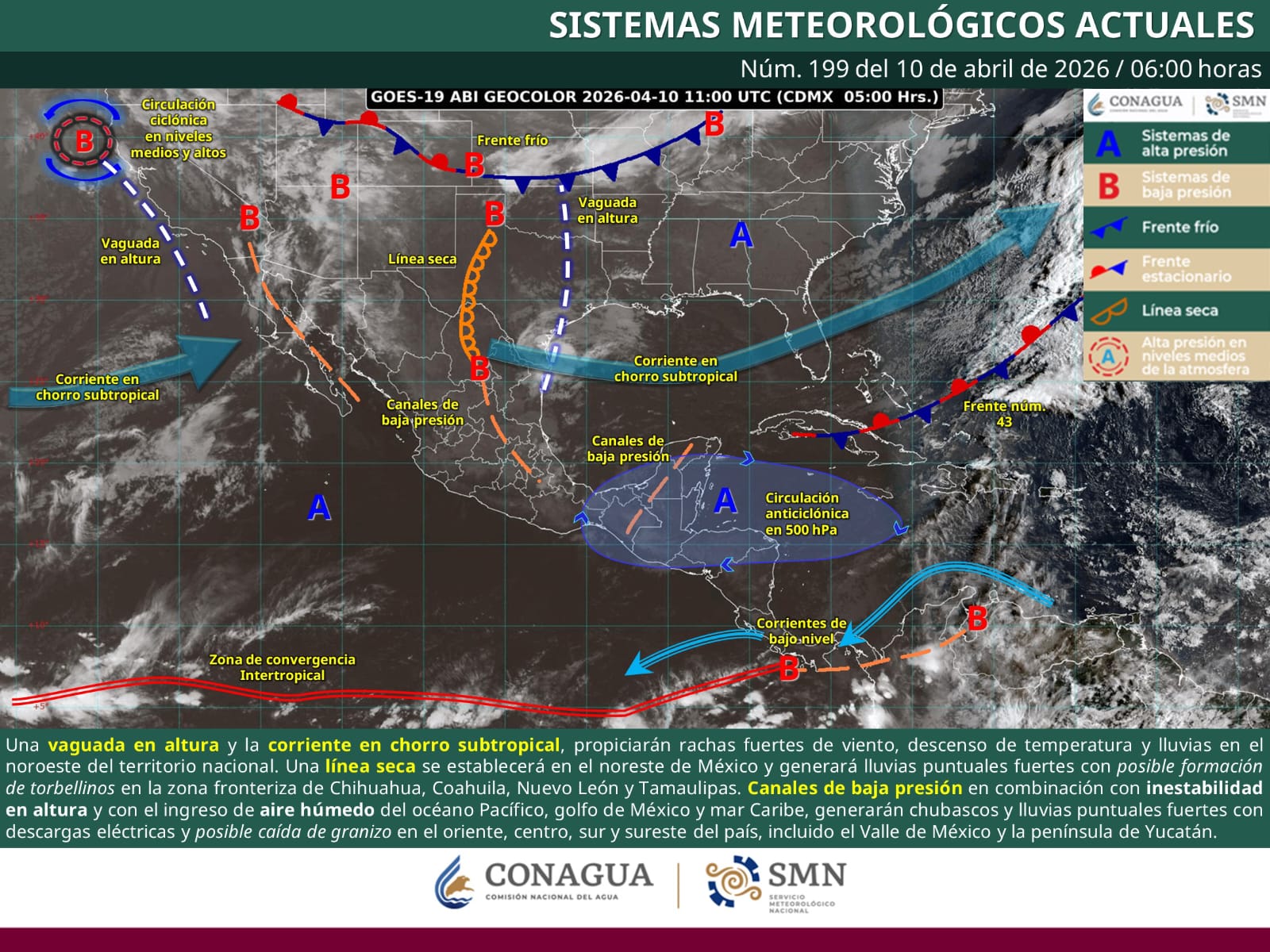 De acuerdo con el Servicio Meteorológico Nacional, se esperan chubascos con lluvias puntuales fuertes de 25 a 50 mm, así como viento de 40 a 60 kilómetros por hora, con posible formación de torbellinos en distintas regiones del estado.
