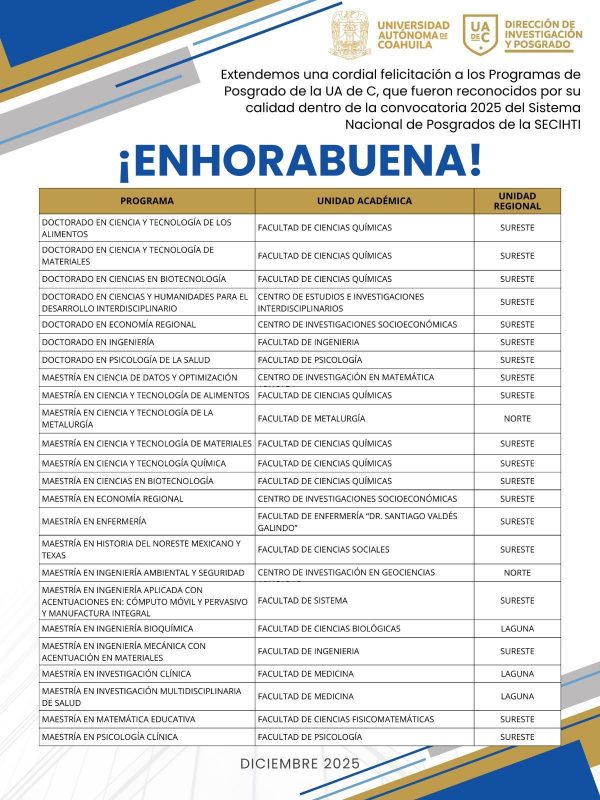 La Universidad Autónoma de Coahuila participó exitosamente dentro de la Convocatoria 2025 del Sistema Nacional de Posgrados de la Secretaría de Ciencia, Humanidades, Tecnología e Innovación, registrando 27 programas de los cuales 24 fueron reconocidos por su calidad, lo que marca un hecho histórico para la institución.