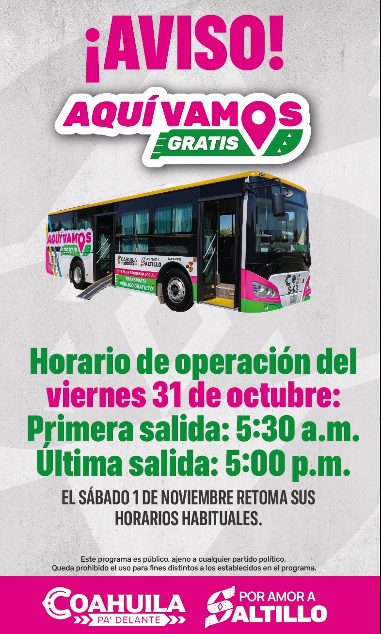 Saltillo, Coahuila de Zaragoza; 30 de octubre de 2025.- El Gobierno Municipal de Saltillo informó que este viernes 31 de octubre las 2 rutas troncales del programa de transporte “Aquí Vamos Gratis” operarán de 5:30 de la mañana con la última salida a las 5:00 de la tarde.