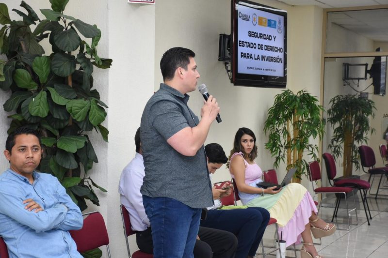 El secretario de Economía, Luis Eduardo Olivares, fue el encargado de convocar a las empresas para generar un canal de comunicación con la autoridad en materia de seguridad para evitar situaciones de riesgo en las empresas, en los traslados de sus mercancías y de todo su personal, aprovechando la coordinación que se ha logrado en la administración estatal con los estados vecinos y las autoridades federales para cuando dichos traslados vayan hacia otras partes de México.