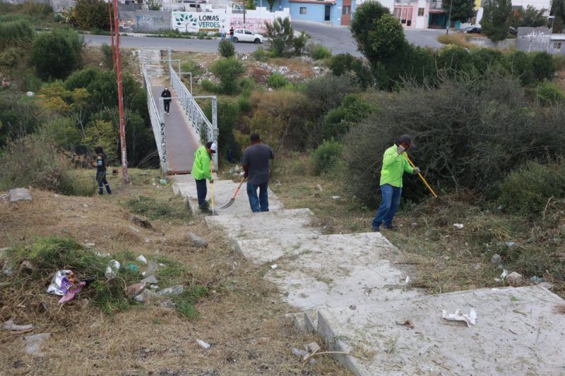 En este punto, cuadrillas municipales trabajaron para mantener en buen estado el puente peatonal y sus zonas aledañas, y evitar la acumulación de basura, tierra y vegetación que pueda obstaculizar el paso o suponer un riesgo entre la población.