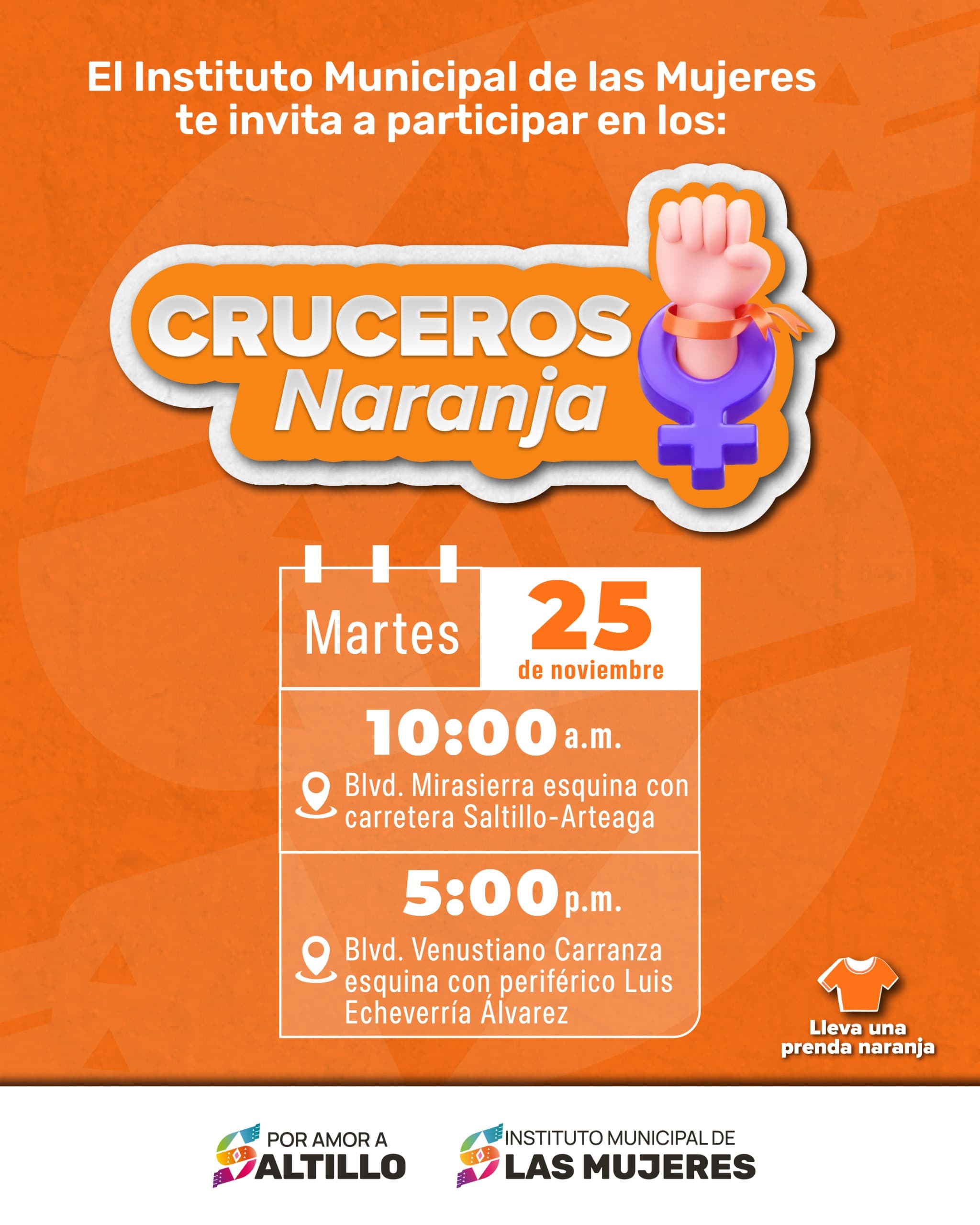 Saltillo, Coahuila de Zaragoza; 24 de noviembre de 2025.- El Instituto Municipal de las Mujeres invita a la ciudadanía a participar en los Cruceros Naranjas que se llevarán a cabo este martes 25 de noviembre.