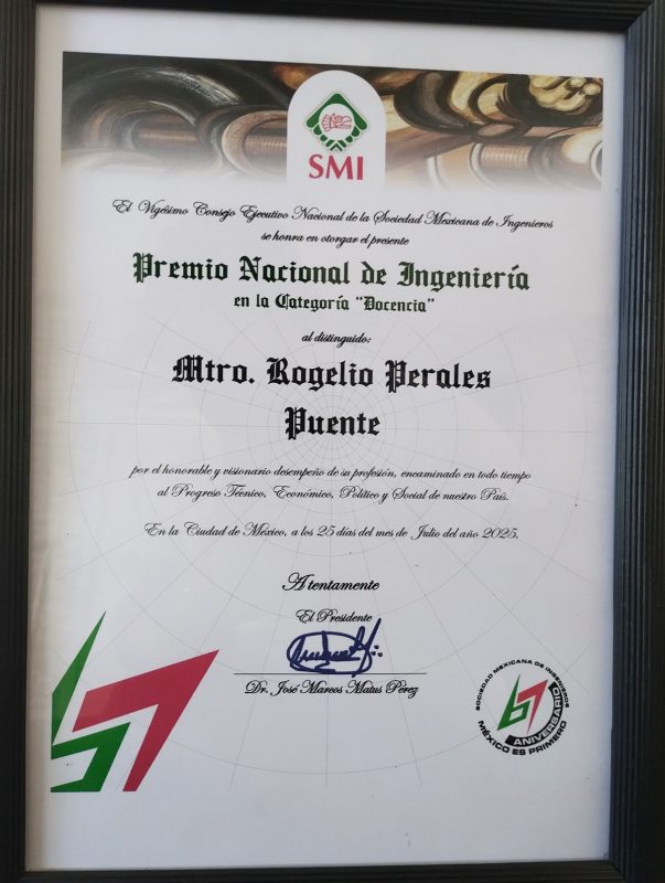 El docente de la Facultad de Ingeniería Civil Unidad Laguna de la Universidad Autónoma de Coahuila, Rogelio Perales Puente, fue galardonado con el Premio Nacional de Ingeniería 2025 en la categoría de Docencia, otorgado por la Sociedad Mexicana de Ingenieros.