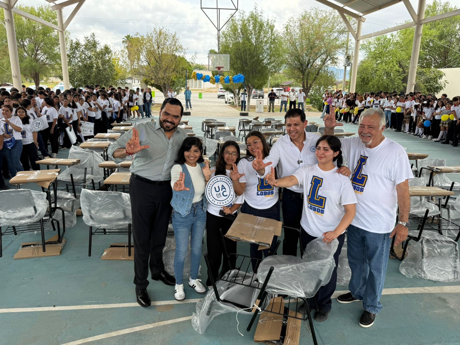 El rector de la Universidad Autónoma de Coahuila, Octavio Pimentel Martínez, acompañado por el director de Planeación, Jesús Alberto Montalvo Morales y el Coordinador de la Unidad Norte, Luis Carlos Talamantes Arredondo, con el fin de fortalecer la infraestructura académica, entregó mobiliario nuevo a la Escuela de Bachilleres “Ladislao Farías Campos”, que consta de 100 mesabancos.