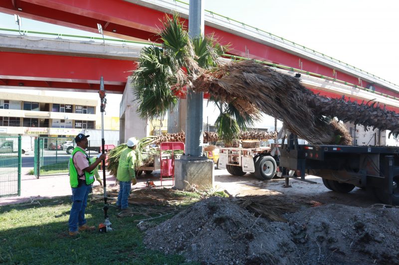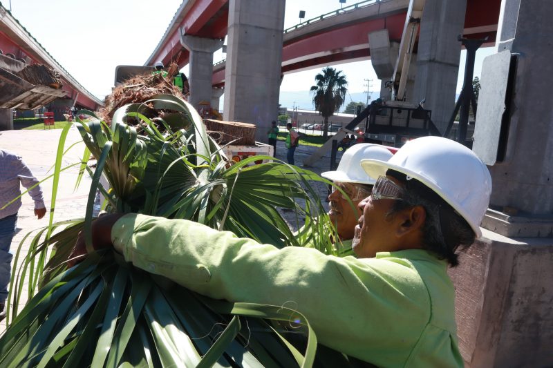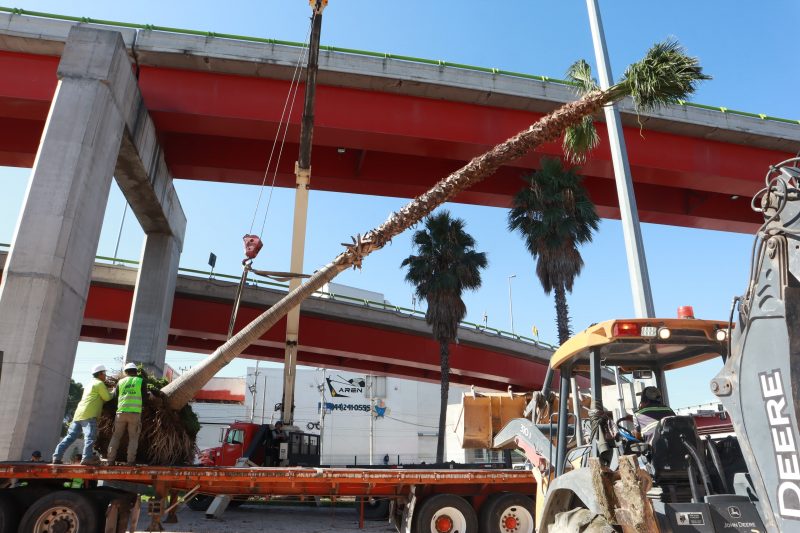 Las especies tipo washingtonias de cerca de 12 metros de altura fueron reubicadas en el distribuidor vial V. Carranza frente a Soriana San Isidro, al norte de la ciudad.