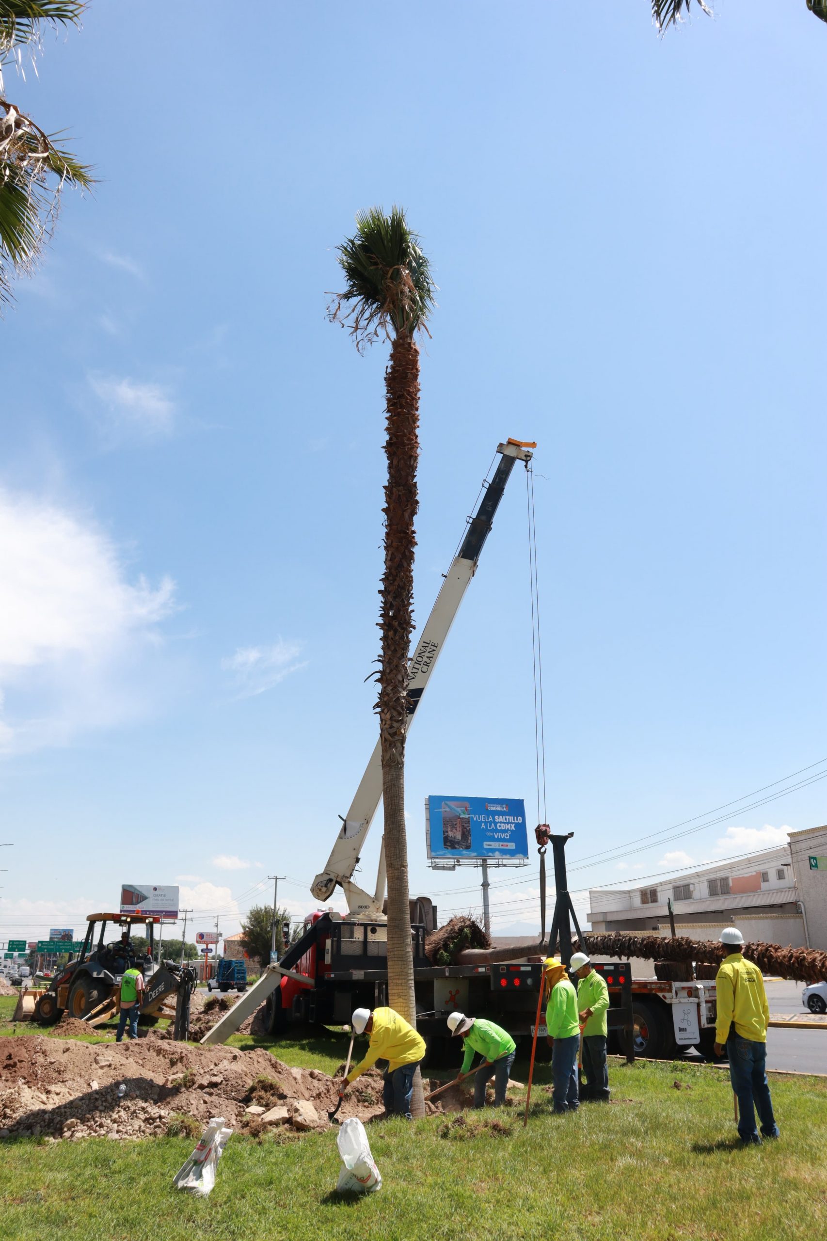 Las especies tipo washingtonias de cerca de 12 metros de altura fueron reubicadas en el distribuidor vial V. Carranza frente a Soriana San Isidro, al norte de la ciudad.