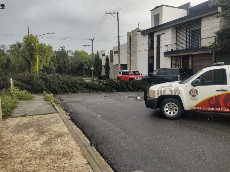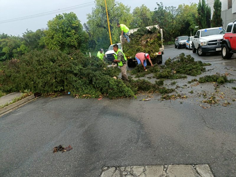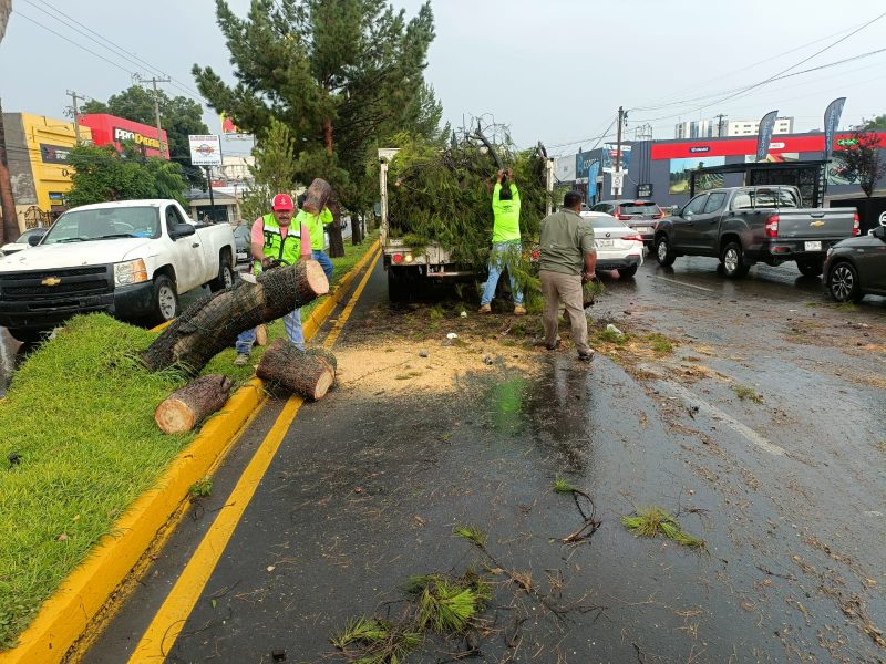 Asimismo, se atiende la caída de dos árboles en la colonia Brisas Poniente, en las calles de Carlos Cárdenas y en México y Brasilia, los cuales, son atendidos.