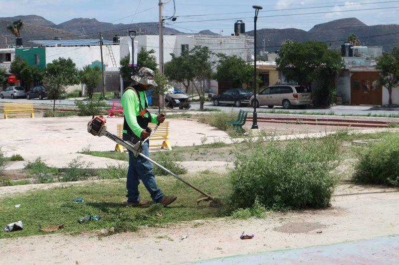 La plaza ubicada entre Avenida Júpiter y la calle Álamo fue atendida por distintas cuadrillas, las cuales eliminaron la basura acumulada, así como la maleza de este espacio público que se ofrece para la diversión de las y los niños del sector, así como para realizar diversas actividades deportivas al aire libre.