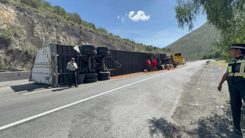 El conductor de un transporte de carga perdió el control de la dirección debido al exceso de velocidad y volcó.