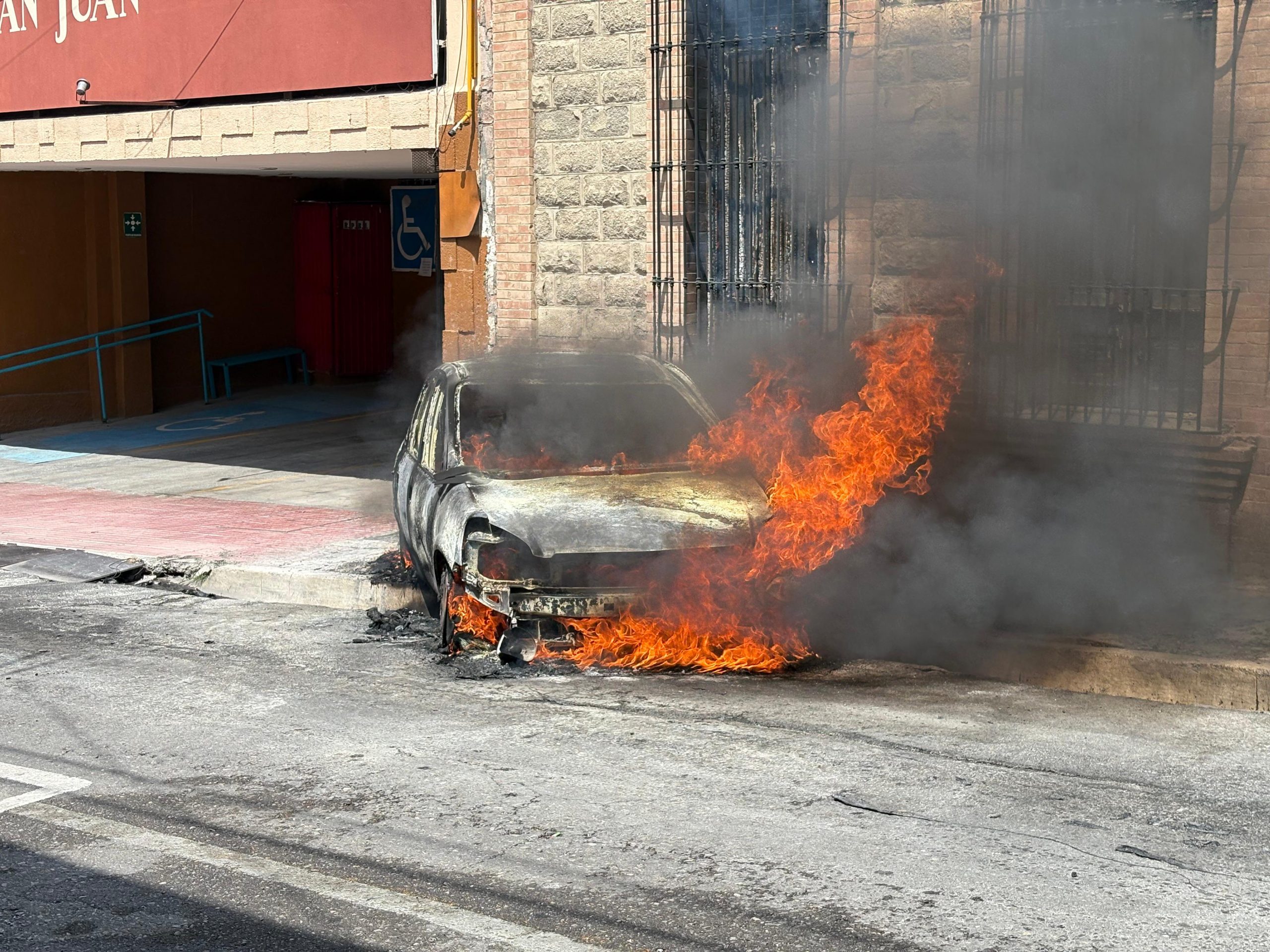 Un vehículo fue consumido por las llamas la tarde de este viernes en pleno Centro de Saltillo, luego de que se registrara un incendio aparentemente provocado por un cortocircuito en el área del motor.