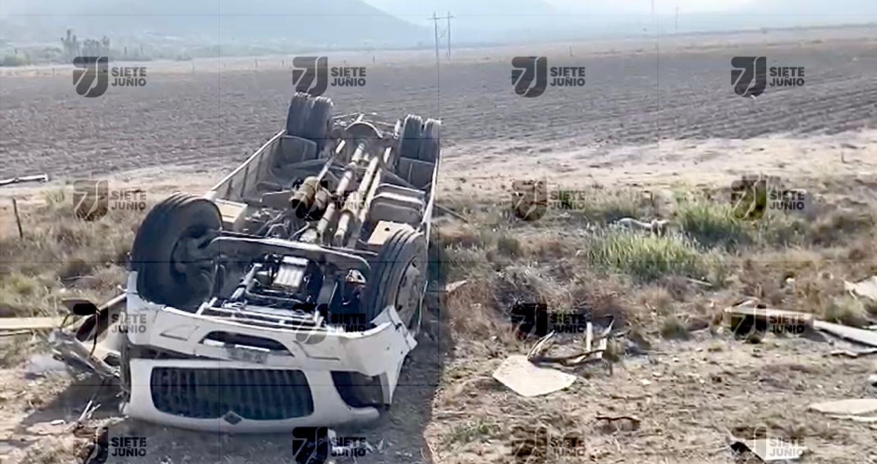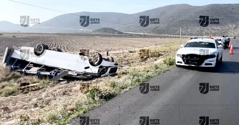Un transporte de personal de la línea Lipu terminó volcado la mañana de este lunes sobre la carretera Zacatecas, a la altura del kilómetro 307, cerca del ejido Tanque de Emergencia.