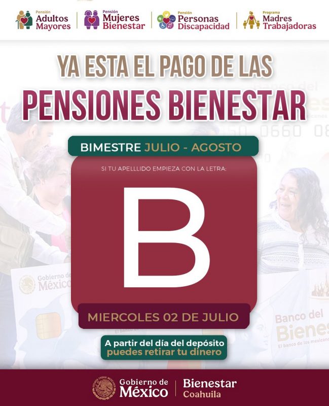 La Secretaría de Bienestar en Coahuila informó que los beneficiarios de la Pensión para el Bienestar, cuyo apellido inicia con la letra “B”, ya pueden cobrar desde este 2 de julio su apoyo correspondiente al bimestre julio-agosto.
